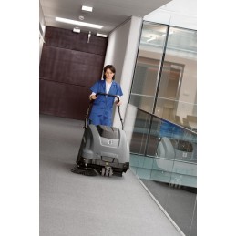 Barredora aspiradora de conducción manual, modelo de baterías; incluye batería y cargador con control electrónico. Para casos en los que ya se dispone de batería y cargador. Sin emisiones de gases de escape y extraordinariamente silenciosa, es ideal para la limpieza a fondo y sin polvo de superficies de más de 600 m2, especialmente en interiores. Apta para la limpieza de alfombras mediante el set opcional de barrido para alfombras. Gran facilidad de manejo gracias al concepto EASY Operation y el recipiente para la suciedad móvil con carrito. Gran maniobrabilidad gracias al motor de tracción y sus compactas dimensiones.