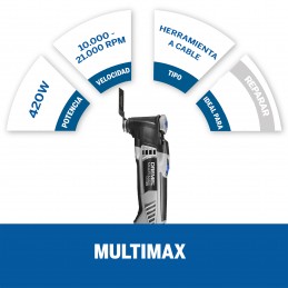 La herramienta oscilante Dremel Multi-Max MM35 cuenta con una gran potencia, se encarga fácilmente de las tareas más exigentes gracias a una parte frontal más compacta y un cuerpo único que proporciona mayor ergonomía, especialmente para el corte al ras. El diseño innovador permite cambiar accesorios de forma rápida y segura resolviendo el problema de necesitar una llave para realizar la misma operación. El ángulo de oscilación más amplio de 3,2 grados permite hacer cortes más rápido y con más precisión. La velocidad variable 10.000 - 21.000 RPM permite un rendimiento y control óptimos con una variedad de materiales.